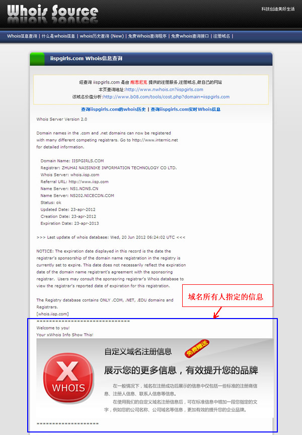 請看 iispgirls.com 的Whois形象廣告服務實例: