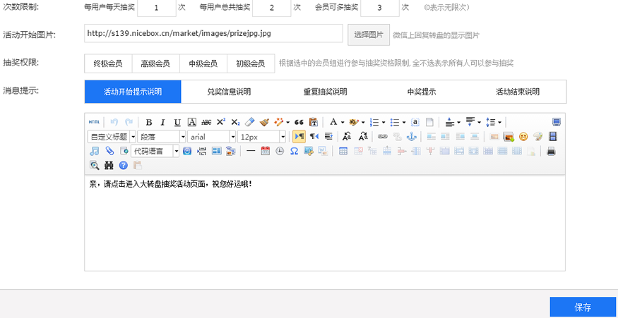 大轉盤為商家提供轉盤抽獎服務,商家只需設置活動時間、活動規則、活動獎品等信息就能發起活動,粉絲進入活動界面,點擊開始抽獎,即有幾率獲得不同類型的獎品。