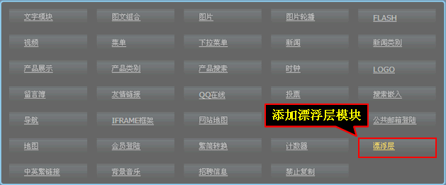 3、輸入“標題”,選擇“邊框”,設置“相關”屬性后點擊“添加模塊”,通過設置參數調整漂浮內容的位置,漂浮內容可以自由編輯。
