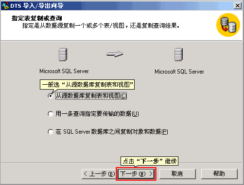 | 5. 選擇復制方式,一般選“從源數據庫復制表和視圖”,點“下一步”繼續 | |