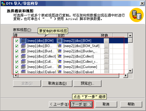 | 6. 選擇要復制的表和視圖,點“下一步”繼續 | |