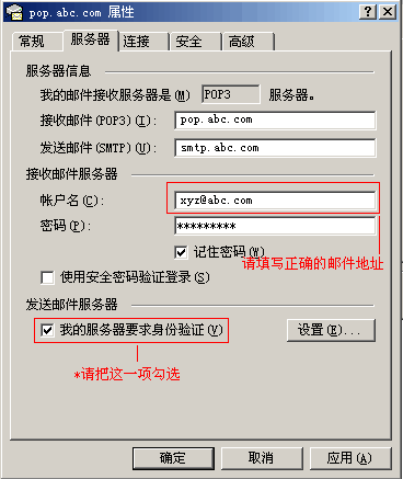 請(qǐng)點(diǎn)擊服務(wù)器選項(xiàng),填寫(xiě)正確的郵件地址,把“我的服務(wù)器要求身份驗(yàn)證”這一項(xiàng)選上。