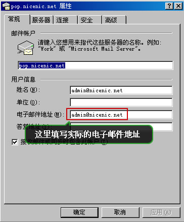 2:如果WEBMAIL收發(fā)正常,請檢查郵件軟件,比如OUTLOOK或者FOXMAIL設(shè)置,以下以O(shè)UTLOOK為例,按圖設(shè)置好用戶信息中的電子郵件地址為您的電子郵件地址,比如abc@nicenic.com,請設(shè)置為全稱.