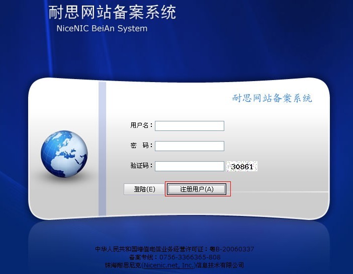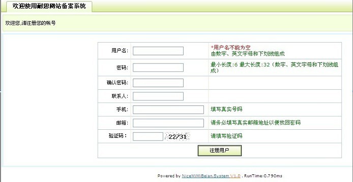 2 、 進入注冊流程后,第一步、填寫登錄用戶名、密碼、手機和郵箱 . 注意 : 手機和郵箱都需要填寫真實的信息 . 用來接收備案號和備案密碼 .