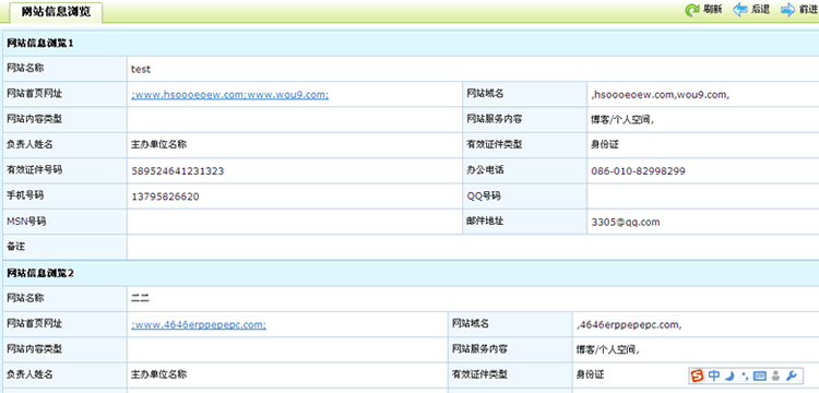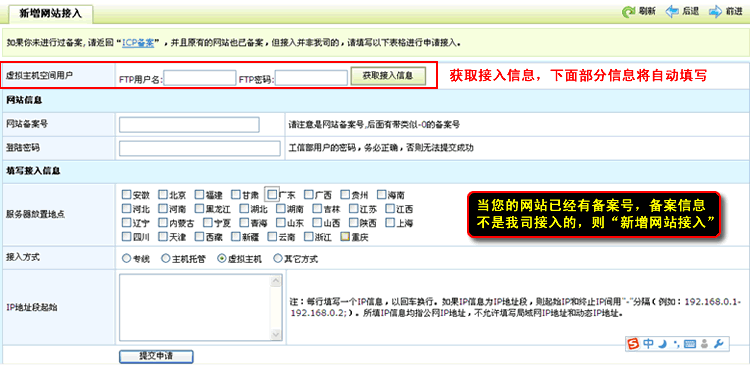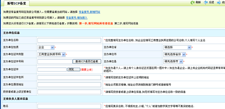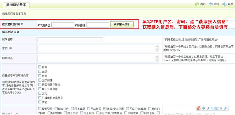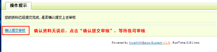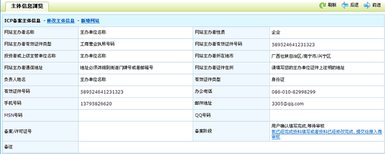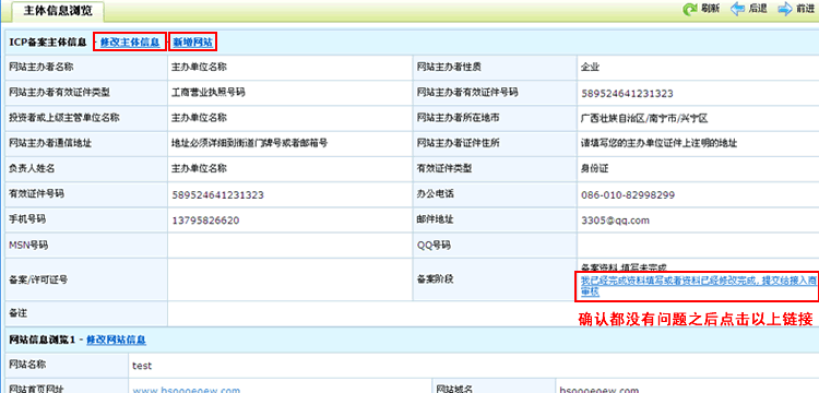 在下一步可以新增網站,可以修改之前提交的網站信息.確認都沒有問題之后,點擊” 我已經完成資料填寫或者資料已經修改完成, 提交給接入商審核”確認提交之后您將不能修改.在我司還未審核之前,可以聯系我司幫您修改,若備案進度是等待通信管理局審核,則需要等通訊管理局審核通過之后才可以修改.